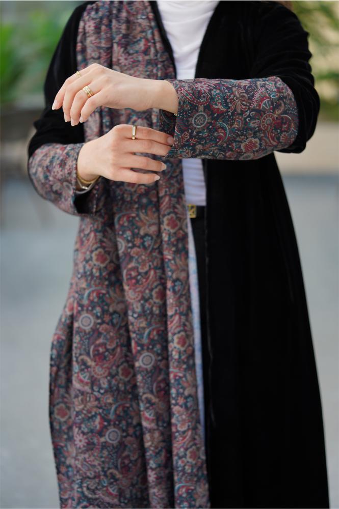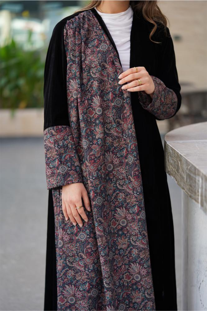 وصف المنتج: عباية سوداء بقماش مخمل مزينة بشال لاصق، بقصة مستقيمة، منسوجة بنوعين من القماش، فخمة بتصميم معاصر،