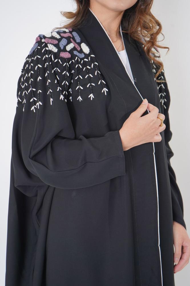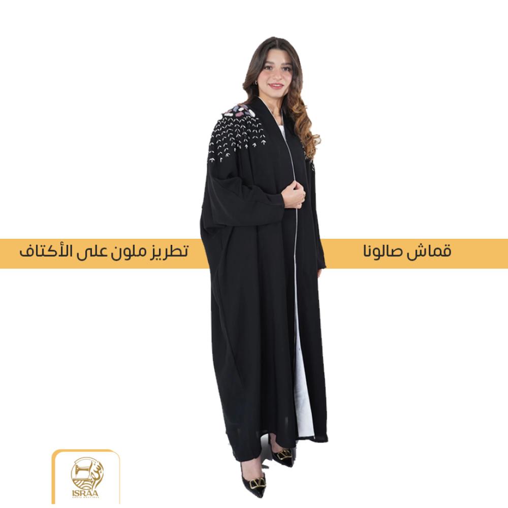 تتميز هذه العباية بأناقة تصميمها وتفاصيلها المميزة، إذ تأتي بقماش صالونا الفاخر والمريح، مع تطريز ملون يزين الأكتاف، مما يضفي عليها جاذبية خاصة وأناقة لا مثيل لها.