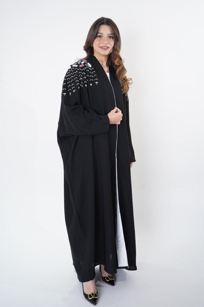 تألّقي بأناقة لا مثيل لها مع عباية سوداء تتميز بتطريز ملون وقصة نصف بشت، تجمع بين الفخامة الكلاسيكية والتصميم المعاصر.