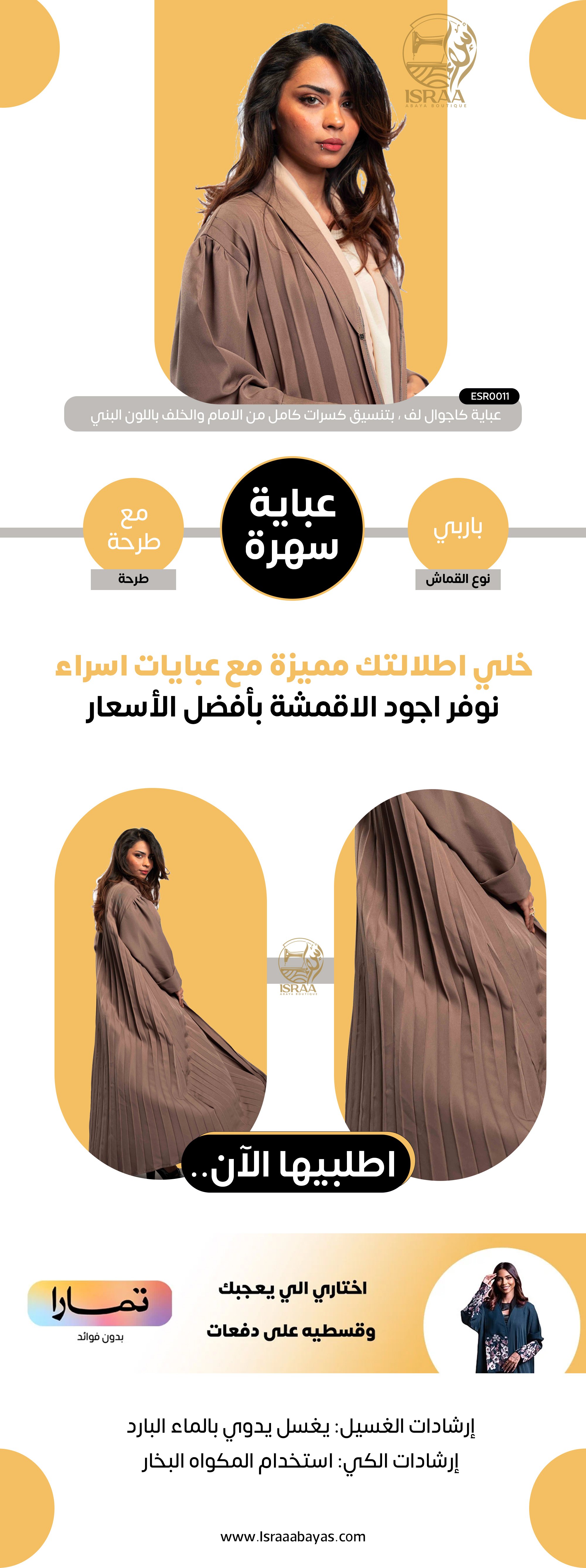 اطلبي عبايتنا الكاجوال الملفوفة بقماش باربي بتنسيق كسرات كامل من الأمام والخلف باللون الكاكي الغامق بقصة مفتوحة مع طرحة الآن واستمتعي بإطلالة أنيقة وعصرية!