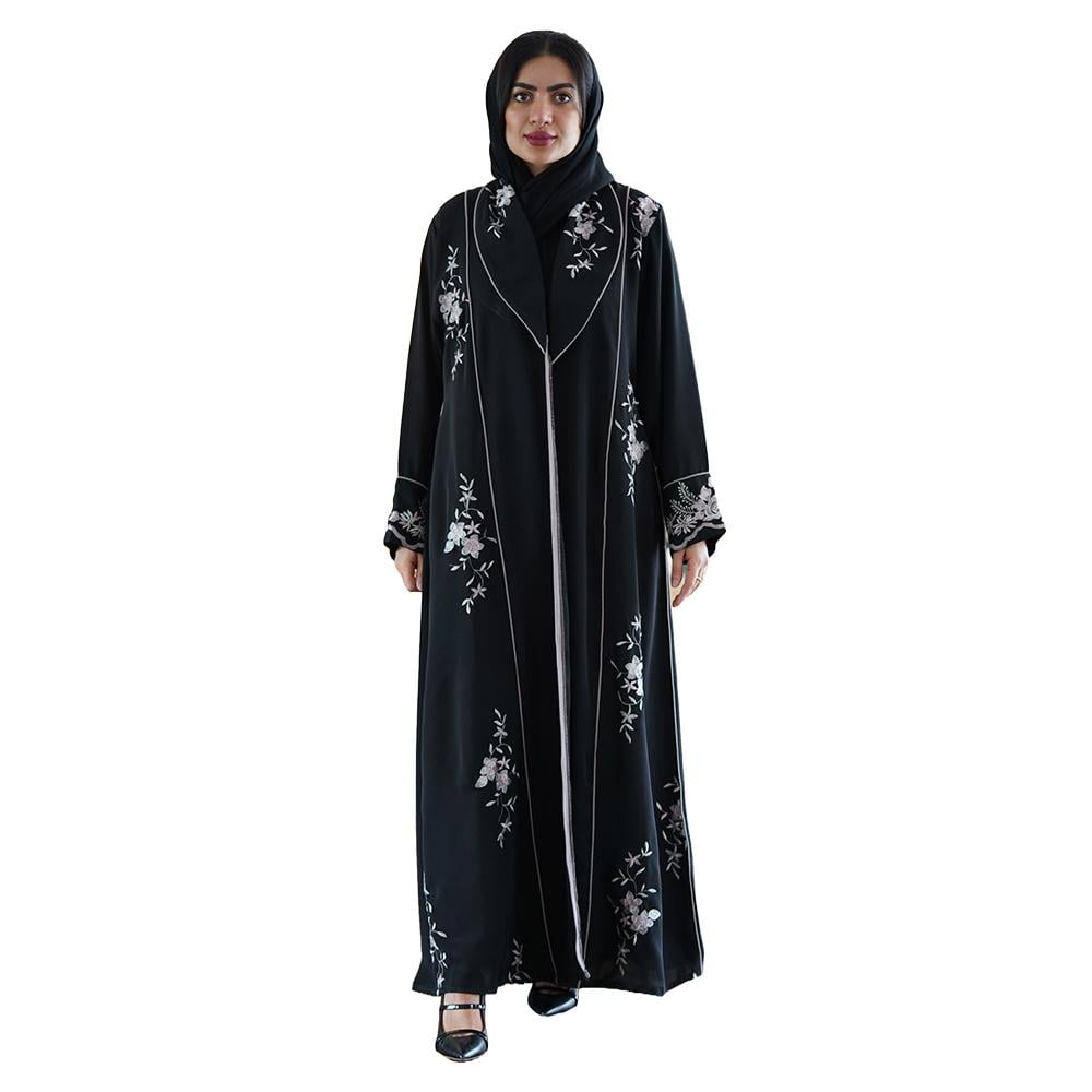 اطلبي عبايتنا السوداء المميزة بتطريز الورود الملونة على الأكمام بقماش انترنت الآن واستمتعي بإطلالة أنيقة ومريحة!