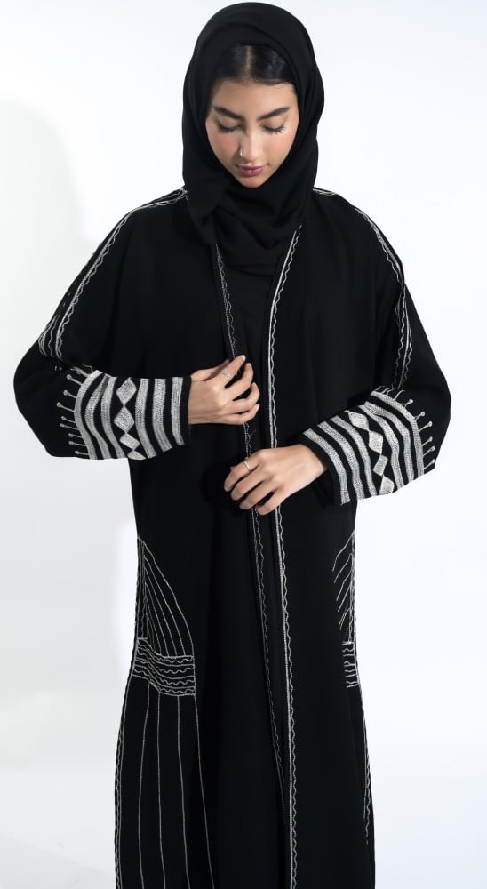 عباية صيفية كلوش بتطريز عسيري باللون الفضي او الذهبي