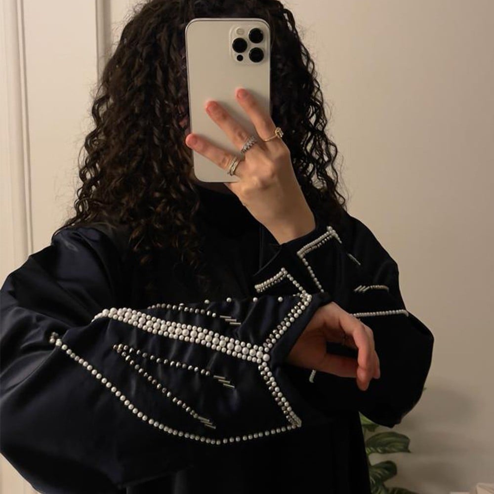 اطلبي عبايتنا تفتة لف و باكمام باللون السكري، مطرزة باللولو باللون الاسود الآن واستمتعي بإطلالة راقية تُضفي لمسة من الأناقة والجمال!