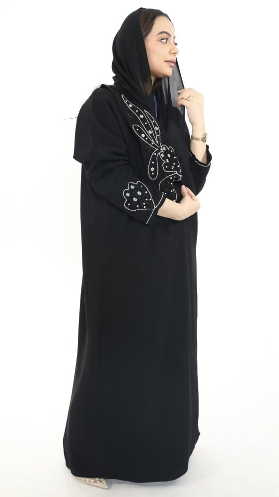 عبايتنا السوداء المطرزة بالأبيض على شكل فراشة هي الخيار الأمثل لكِ!