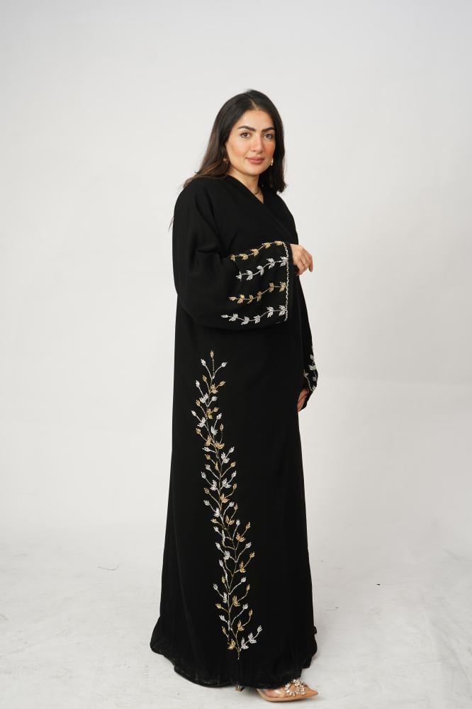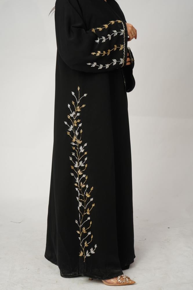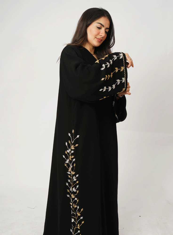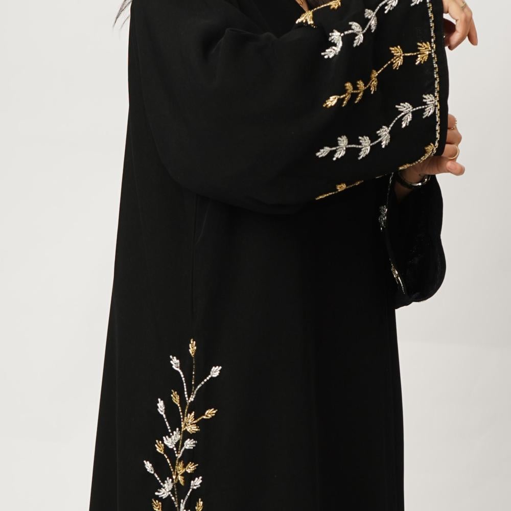 عباية سوداء بتطريز فضي وذهبي – بقماش قماش رموش نص كلوش لمسة فخامة استثنائية